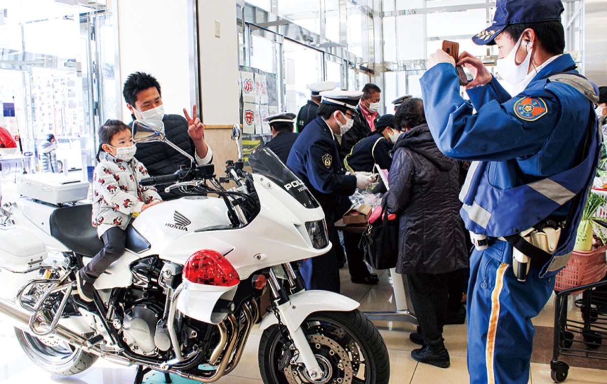 店舗入口にブースを設置し、リストバンド型やシール型、自転車のタイヤに着けられるタイプなどを用意。署員らは、「夜間は人の姿が見えづらい。反射材は車のライトに反射して光るので、ぜひ着用を」と買い物客に説明しながら配布。受け取った女性は、「孫が遅くに帰ってくるので着けてあげたい」と笑顔で話していた。