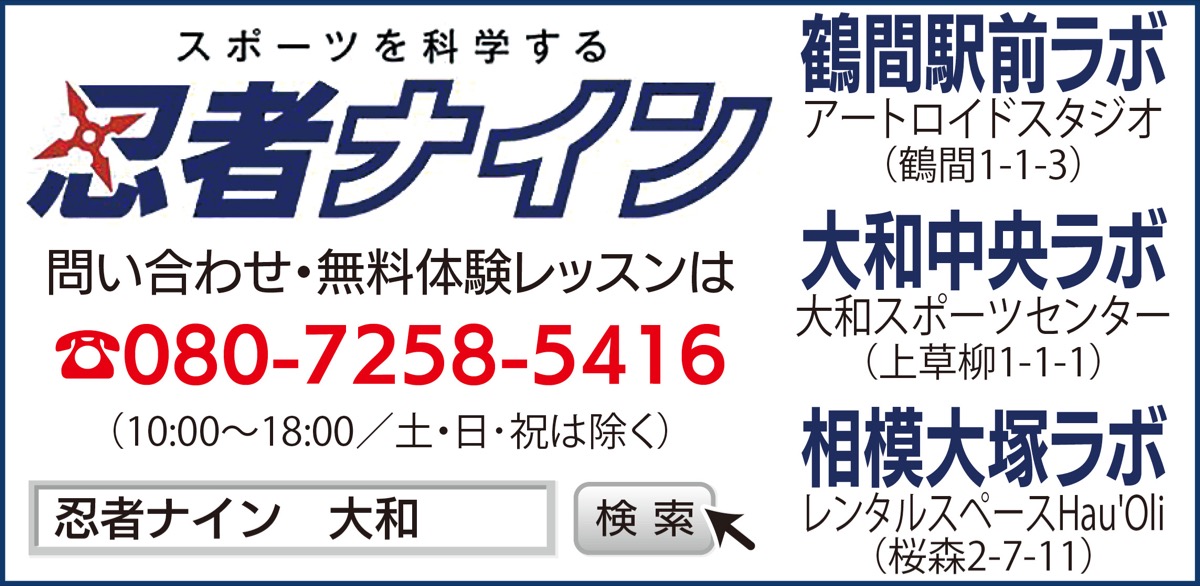 全国展開する「忍者ナイン」は、毎週金曜レッスンの鶴間駅前ラボのほか、大和中央ラボ(水曜)、相模大塚ラボ(土曜)が開校中。走る、跳ぶ、投げるなどの基本動作を300種類の遊びを通して楽しみながら習得でき、チームプレイの中で協調性も育っていく。まずは無料体験を。