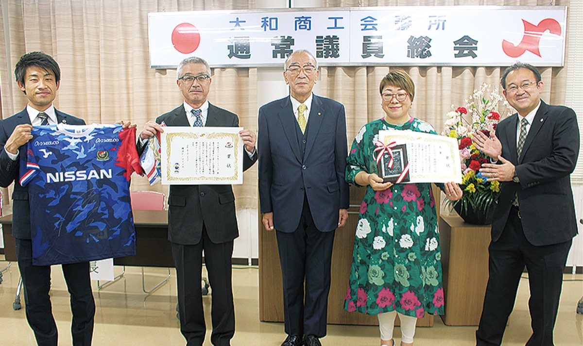 議案審議終了後には、「やまと街中行ってみたいお店大賞」の入賞店の表彰が行われた。大賞に選ばれたレンドルフ南林間店の橋本朋子さんには、河西会頭から賞状と盾が、横浜F・マリノス賞に選ばれた牛の家ステーキ&ハンバーグの桃井豊代表には、マリノス子会社の服部哲也さんから賞状と、チームフラッグ、市内出身の高野遼選手のサイン入りユニホームが贈られた。(準大賞の大乃寿司大和店、南イタリア家庭料理ポルコロッソは欠席)