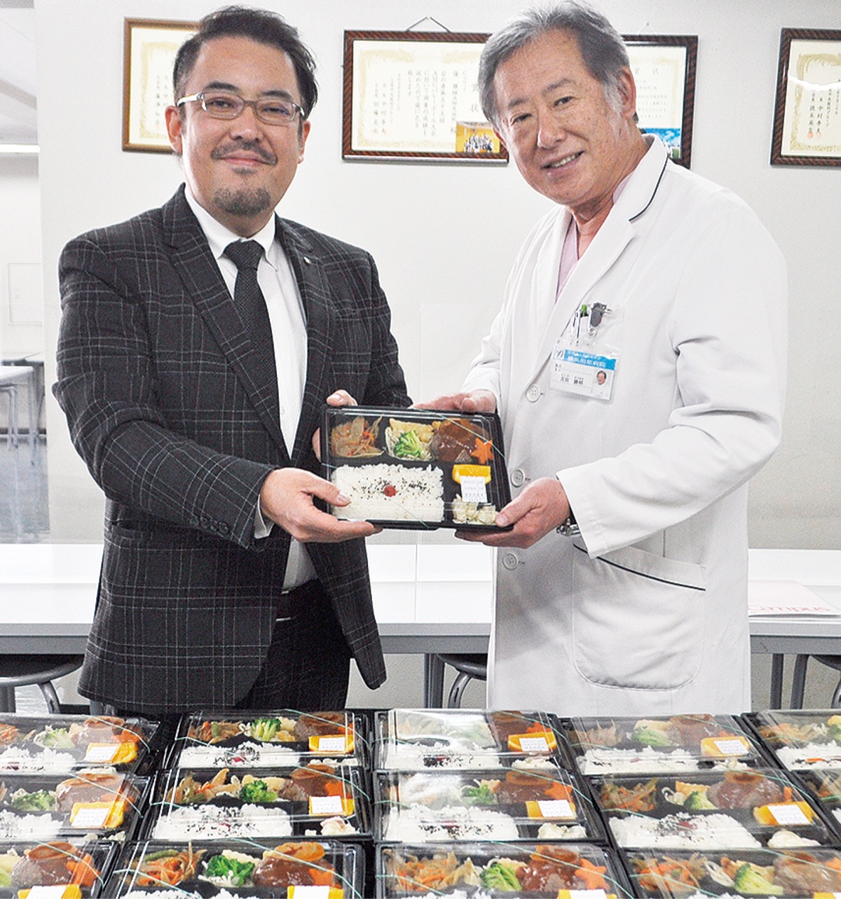 病院で弁当を手渡した安田社長は「ハンバーグは全て手作りで、一つひとつ形が違います。食事を通じ、病院の皆さんが少しでもホッとする時間を作ることができれば」とコメント。吉田勝明院長(当時)は、「手作りの弁当を食べることができ、職員皆喜びます」と感謝の気持ちを伝えた。