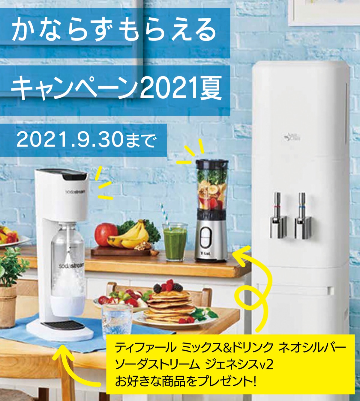 同社では現在、新規入会者に人気家電を進呈する「かならずもらえるキャンペーン」を実施中。今年は【1】手軽に炭酸水を作る「ソーダストリーム ジェネシスv2」、【2】スムージー作りにも役立つT-fal製ブレンダー「ネオ シルバー」のどちらかを選ぶことが出来る。まずはHP(https://shonan.aquaclara-web.jp/)で確認か気軽に問合せを。