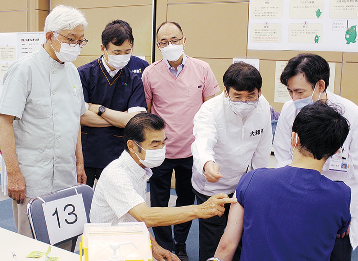 集団接種会場が増えることで、医師の確保が課題となる中、大和市では、大和綾瀬歯科医師会(近藤清志会長)に協力を打診。同会の歯科医師を対象に6月7日から9日までの3日間、市立病院で実技研修が行われた。初日の7日には13人の歯科医師が参加。大木哲市長も視察に訪れた。