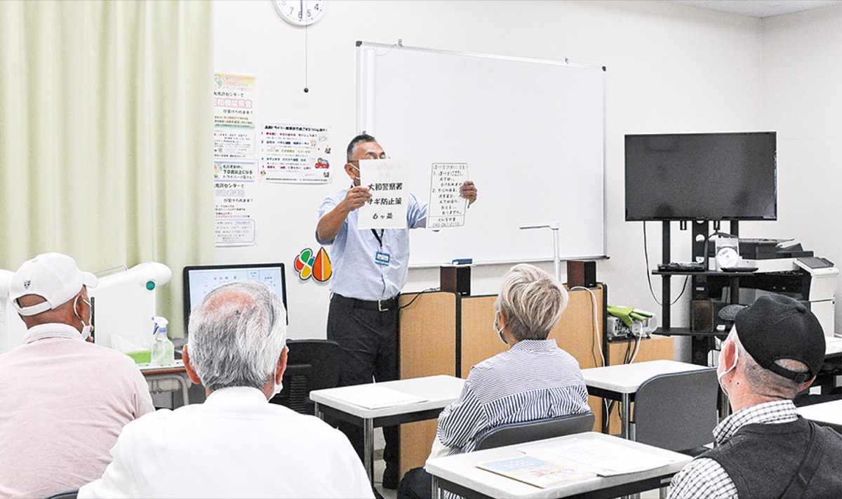 大和自動車学校(深見西)では70歳以上のドライバーが運転免許証を更新する際に受講している「高齢者講習」の場を活かし、特殊詐欺被害を防止するための啓発活動を行っている。