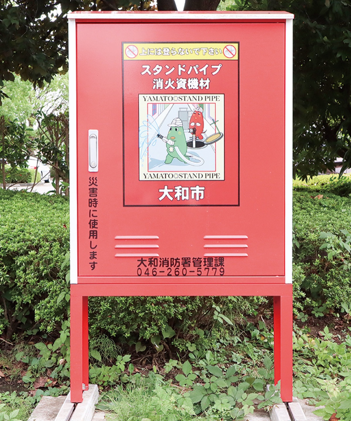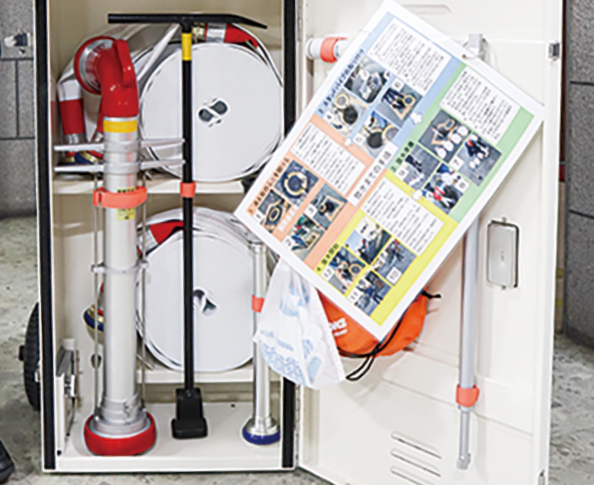 これは「スタンドパイプ消火資機材」と呼ばれるもの。市内537カ所に設置されており中にはパイプや消火用ホース、常備灯、ヘルメットなど、消火活動に必要なものが一式揃っている。震度5以上の揺れが起こると箱が自動で開く仕組みで、市内1400カ所の消火栓や排水栓に繋いで使用でき、15メートル先まで放水することができる。