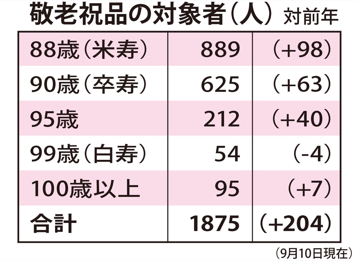大和市では「敬老の日」にちなみ、市内在住の高齢者の長寿を祝い、9月10日時点で88歳(米寿)、90歳(卒寿)、95歳、99歳(白寿)、100歳以上の市民に敬老祝品を送っている。市人生100年推進課によると今年度の対象は1875人で、昨年より204人増えた。