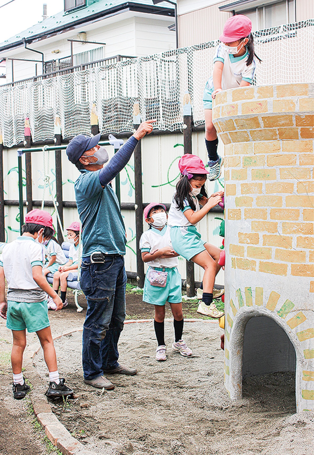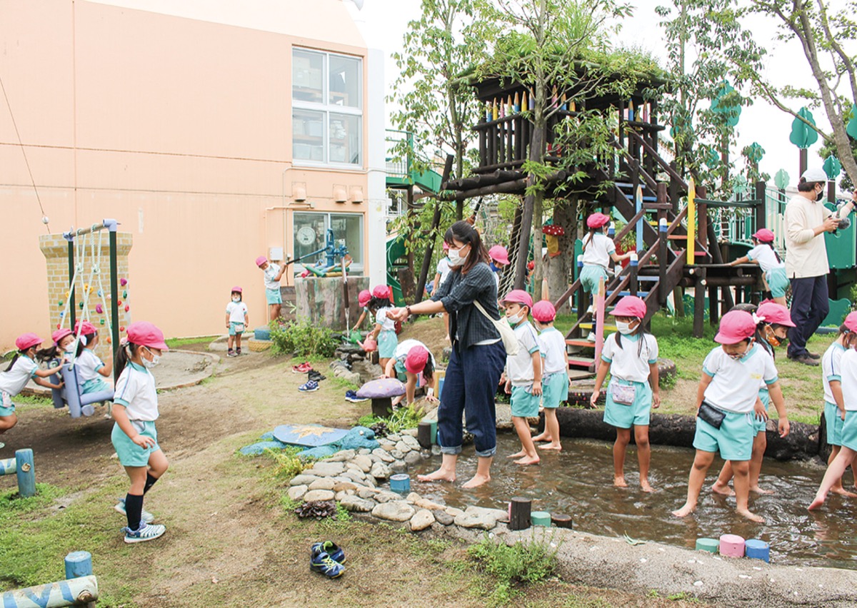 園児たちは早速中央にそびえるツリーハウスや土管を模したクライミング遊具によじ登ったり、手押しポンプで池に水を張ったりして「遊び初め」を楽しんだ。金井さんは「自由に作らせてもらった。遊び方を自分たちで工夫してほしい」と園児たちの笑顔に目を細めた。