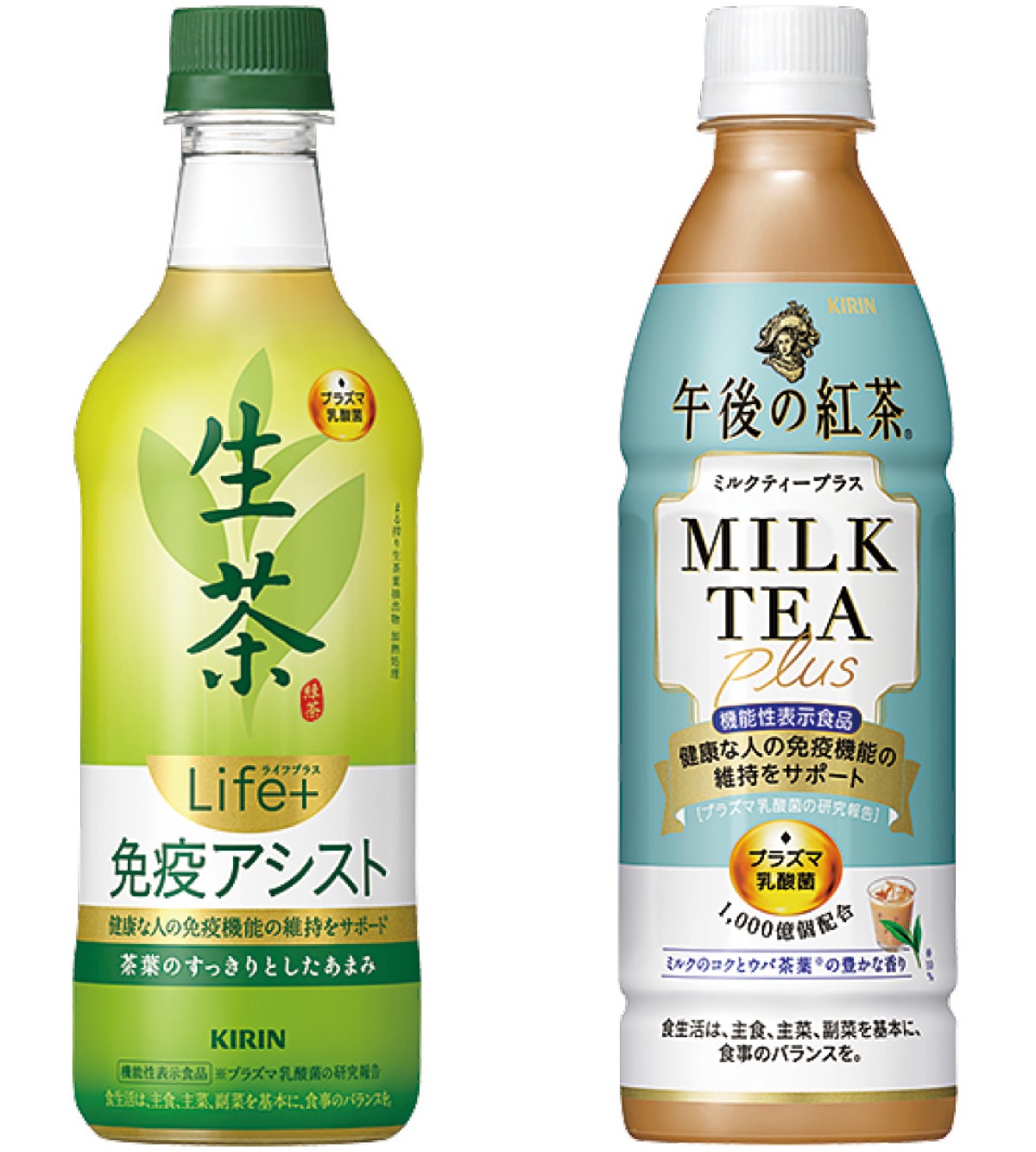 キリンビバレッジ(株)は10月12日、キリン独自のプラズマ乳酸菌を使った新商品「午後の紅茶ミルクティープラス」と「生茶ライフプラス免疫アシスト」を発売した=写真。