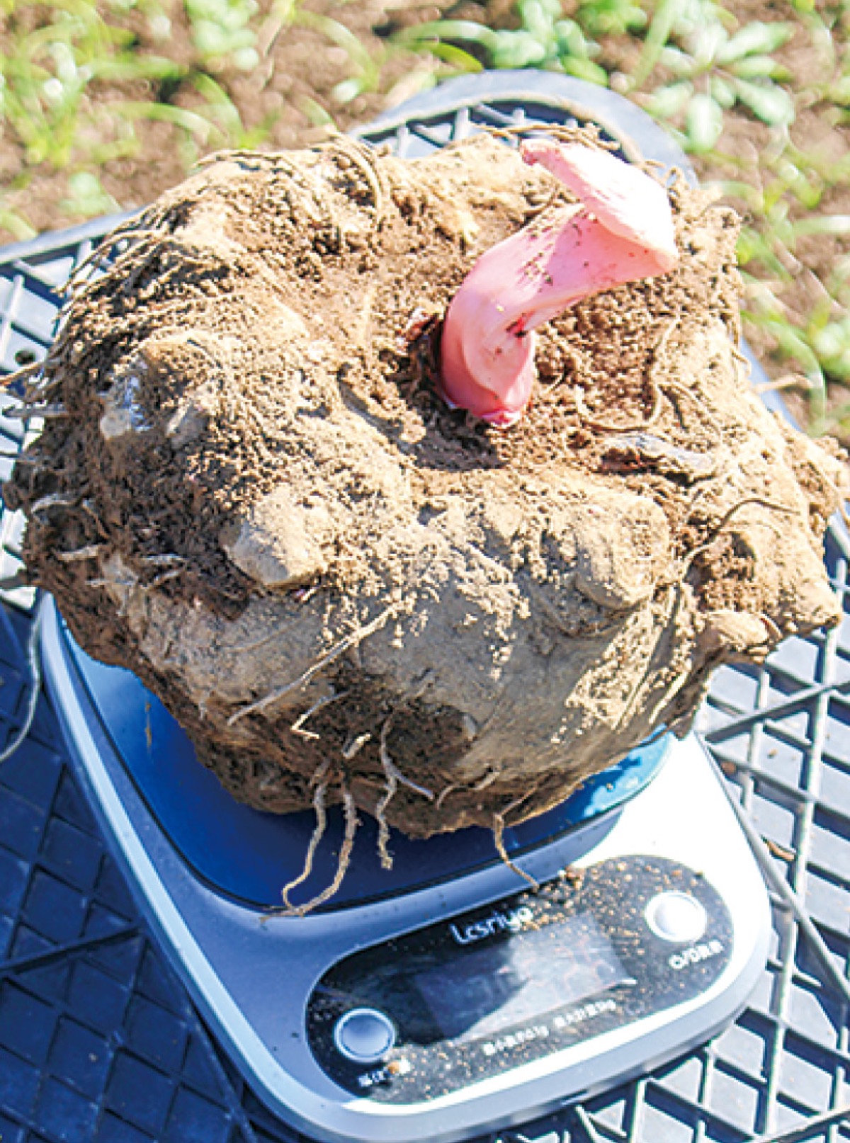 栽培・収穫したのは、神奈川県産こんにゃくゼリーを製造・販売している神奈川ツルマフーズ株式会社(下鶴間)の生松芳惠さんら。生松さんらは6年前から自ら畑を借り、こんにゃく芋を育てている。