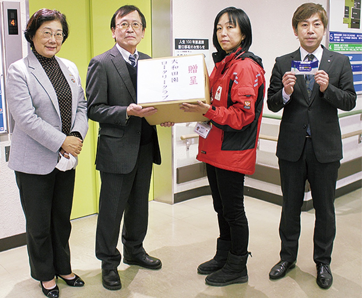 大和田園ロータリークラブ(古谷田紀夫(みちお)会長=写真左から2人目)が1月11日、除菌シート200個を神奈川県赤十字血液センターに寄贈した。同クラブは毎年奉仕活動の一環として、同センターの献血活動に協力していた。しかしコロナ禍で協力が難しいことから、物品での協力を申しでた。寄贈された除菌シートは2月にイオンモール大和での献血の際、協力者に配られる。