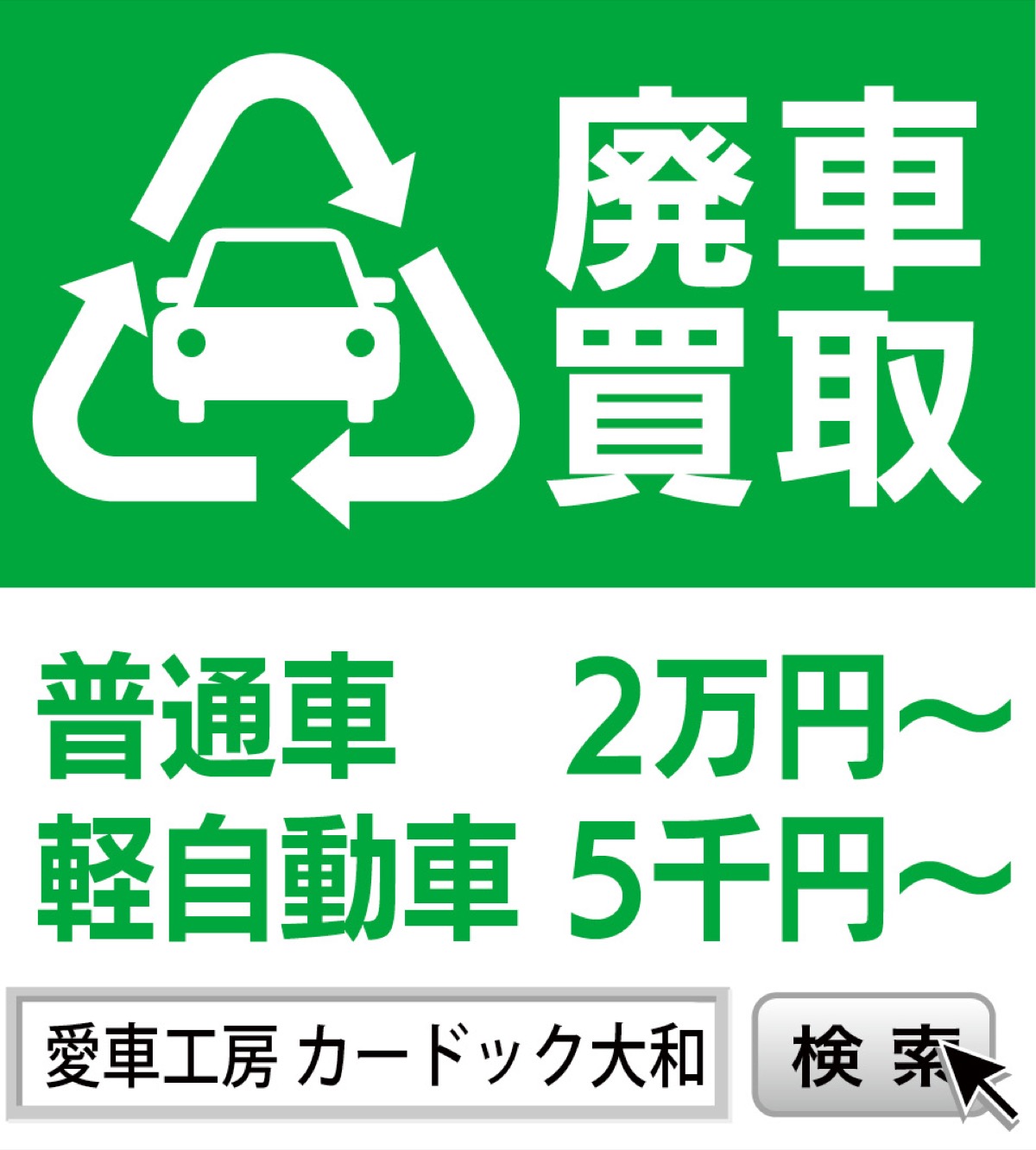 「処分に困った要らない車が…」「廃車に費用はかかるのかしら?」など、免許返納や乗らなくなった車の処分なら深見の光が丘交差点にある「愛車工房 カードック大和」にお任せを。