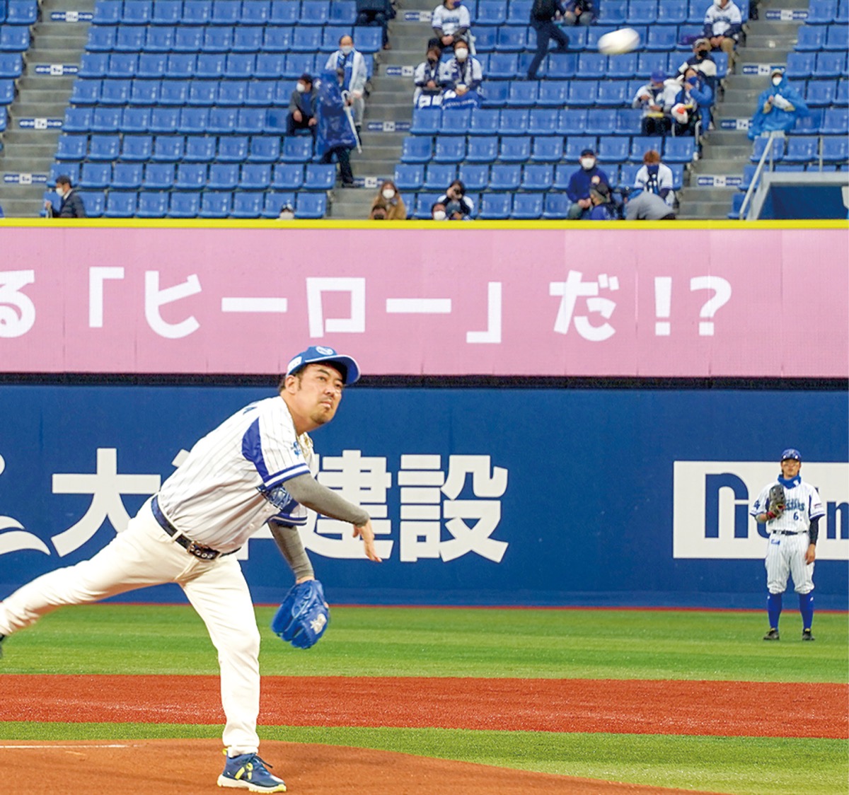 プロ野球のセ・リーグ公式戦「横浜DeNA―東京ヤクルト」の3回戦が15日、横浜スタジアムで開催された。大和市深見西に本社を構える(株)安田物産の冠試合として行われ、安田幹仁社長が始球式に登場した。