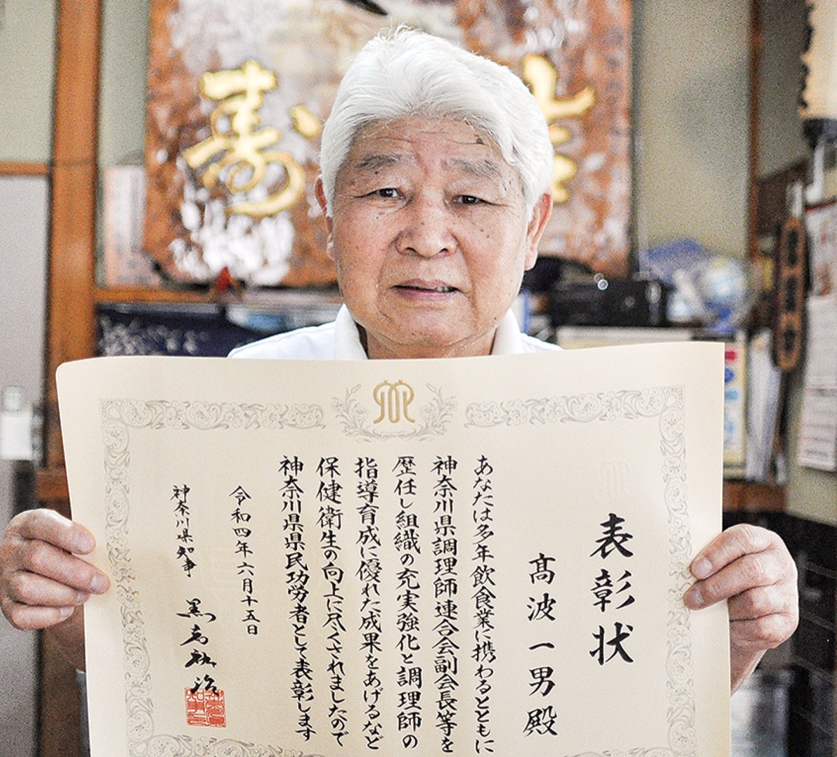 一般社団法人神奈川県調理師連合会の会員になって40年。会の活動に長年尽力し、現在は副会長を務める。受賞に際し「やっぱり嬉しいね」と笑顔。鶴間駅すぐの場所で蕎麦屋を開いて57年。「真面目なものを出す」ことにこだわってきた。