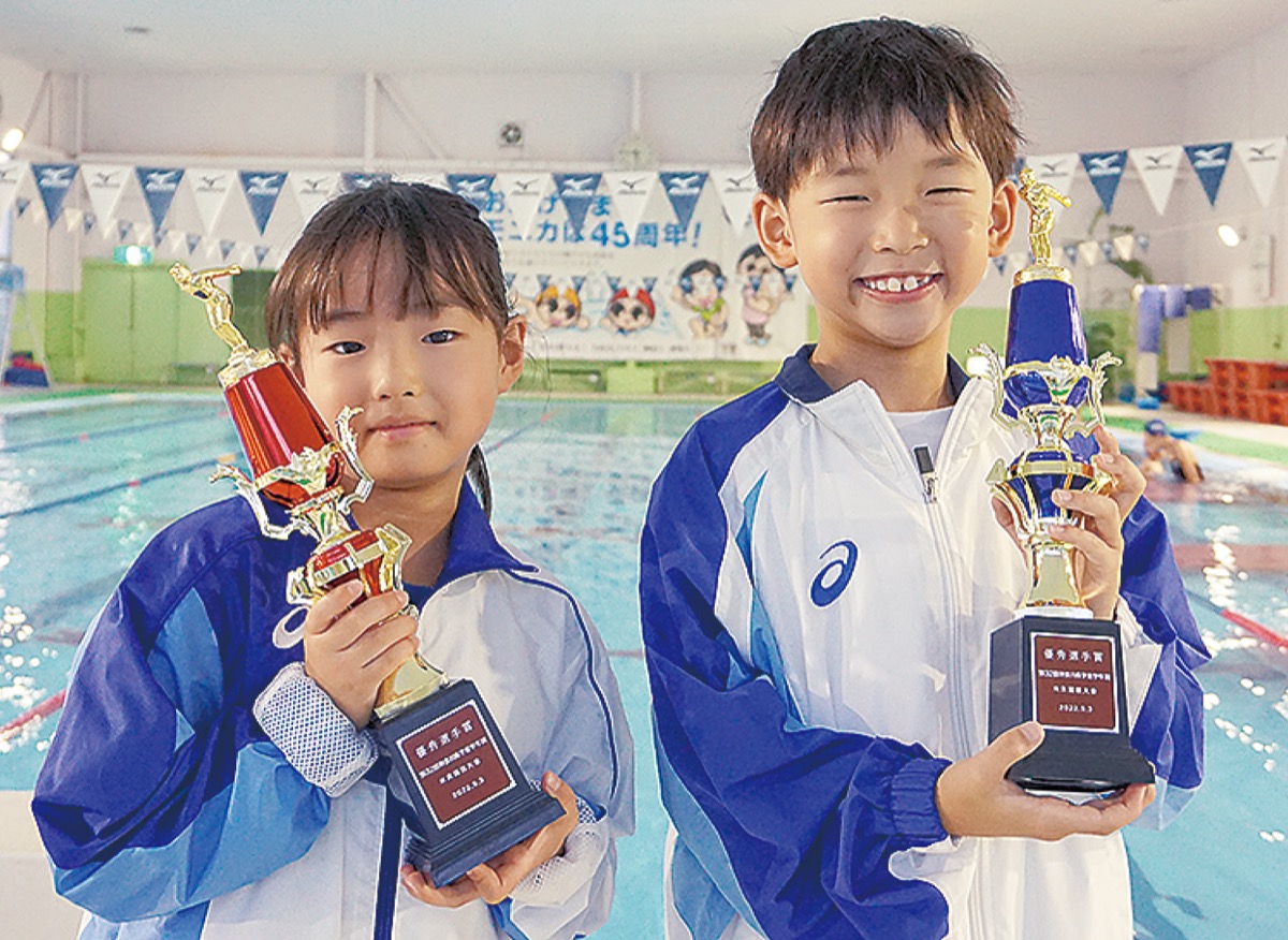 石田君は50mバタフライ(小学校1年)で1位、50m自由形(同)で2位の快挙。「やったーっ!て。すごいでしょってお母さんに言いました」と笑顔で話した。また遠藤さんは50m自由形(同)で1位、50mバタフライ(同)で2位の成績に「お母さんにトロフィーを見せたら、すごいねって」と嬉しそうな表情を見せた。