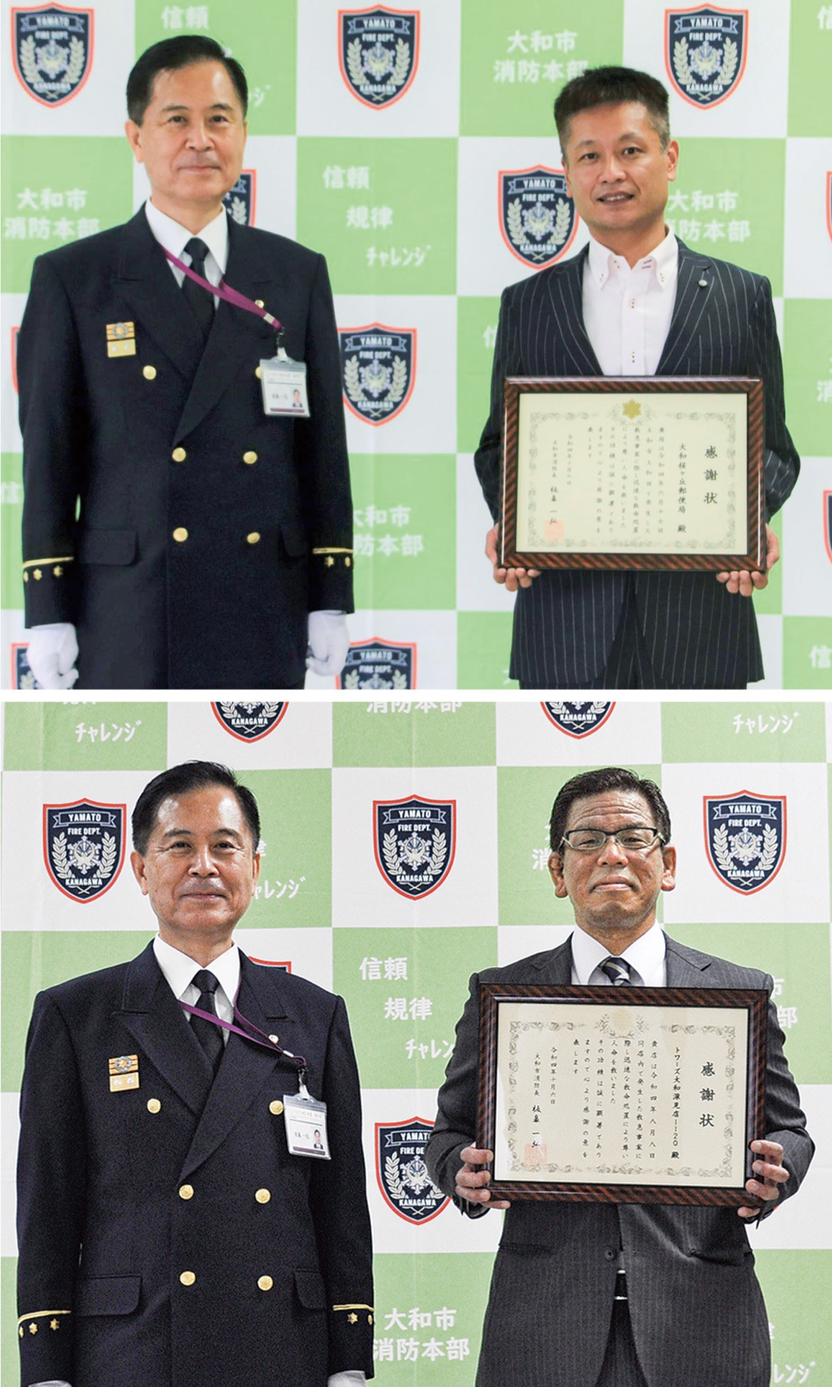大和市消防本部(板鼻一弘消防長)は10月6日、適切な救急活動を行い、人命を救助した2施設に感謝状を贈呈した。同本部で行われた贈呈式には、大和桜ヶ丘郵便局の三村公一局長と、パチンコ店「トワーズ大和深見店1120」の小山直登店長が出席した。