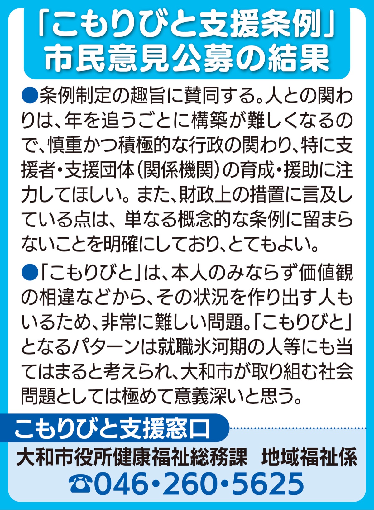 今後も「こもりびと」を含む誰一人取り残さない、「誰でも居場所と出番のある社会」の実現に向け、活動してまいります。お気軽に御意見、御要望をお寄せください。