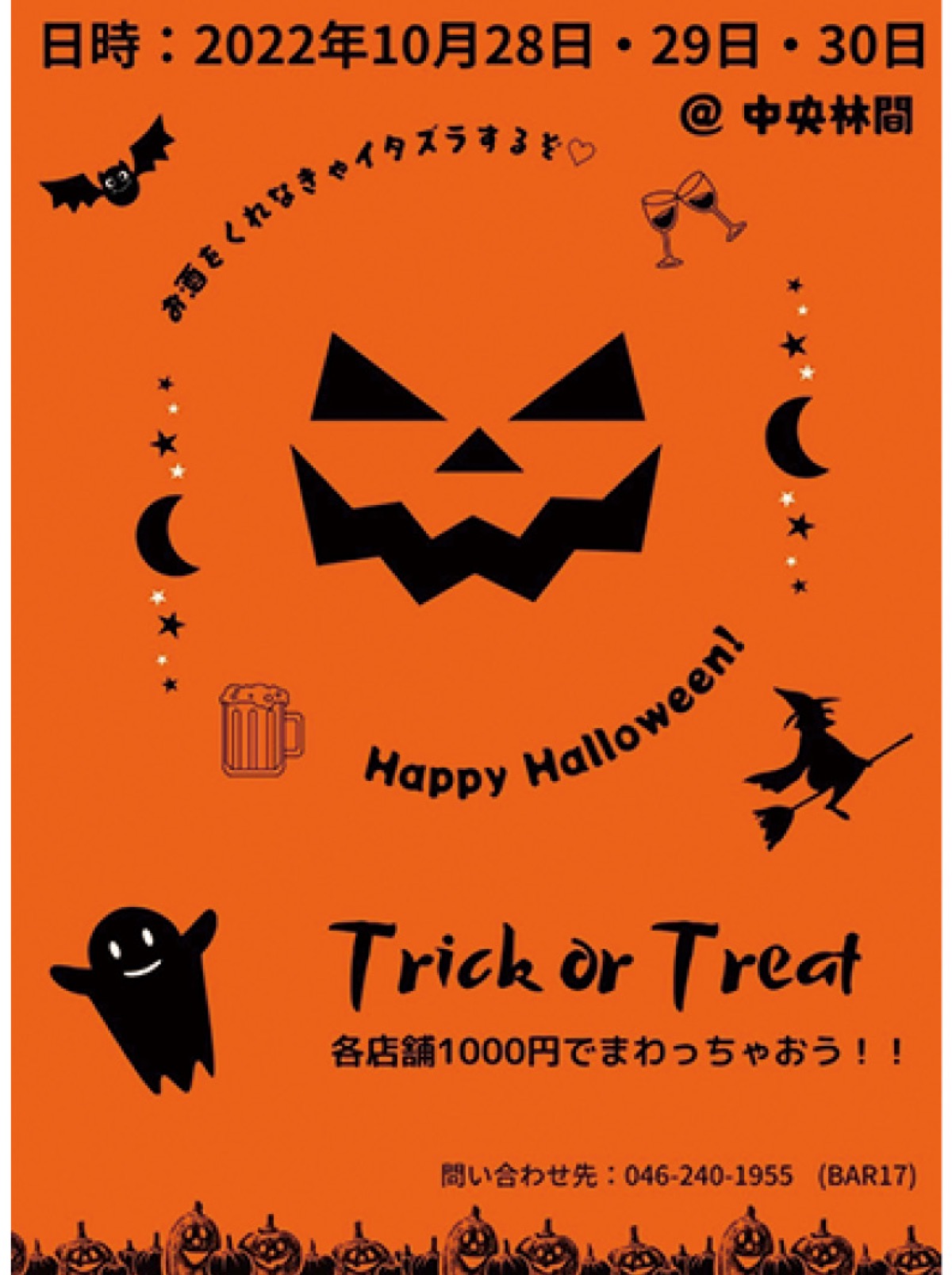 各店をまわり「ちょい飲み」を楽しむ催し「お酒をくれなきゃイタズラするぞ♡Happy Halloween!」が10月28日(金)から30日(日)、中央林間駅周辺の8店舗を会場に開催される。