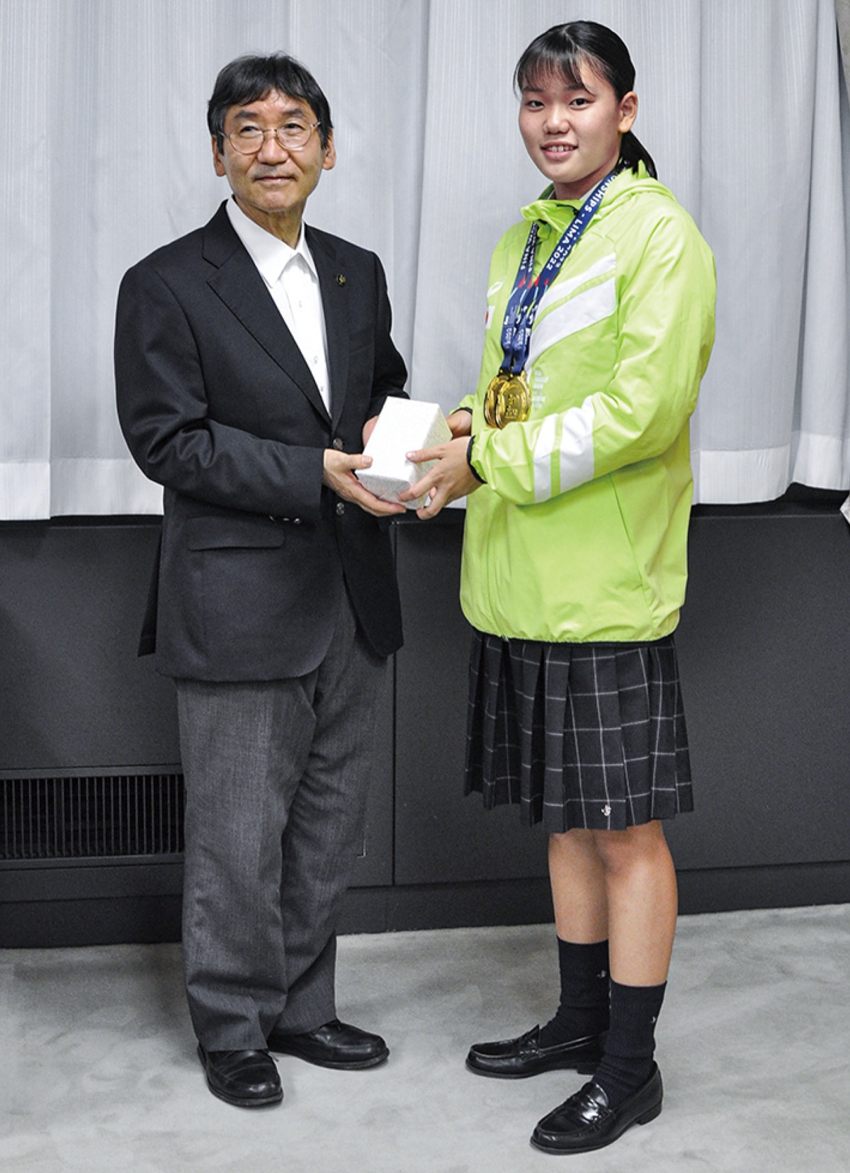アリーナつきみ野SCに所属する平井瑞希さん(15)が 10月11日、大和市役所を訪れ、大木哲市長に夏に出場した「第8回世界ジュニア水泳選手権大会」で、女子100mバタフライと400mメドレーリレーで2冠を達成したことを報告した。