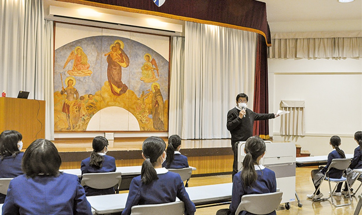 このことを受け11月14日、6年生20人がフレスコ画を教材とした授業を受けた。児童は山口道孝神父(厚木カトリック教会)から時折、「描かれた百合の花が意味するものは」などと質問を投げ掛けられながら画の背景にあるものを学んだ。