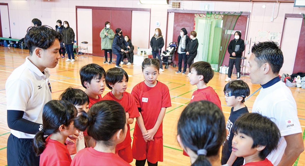 福田小学校体育館を練習拠点にする小学生ドッジボールクラブ「桜火魂」に1月8日、2022年ドッジボール W杯カイロ大会に出場した日本代表選手3人が訪れた。