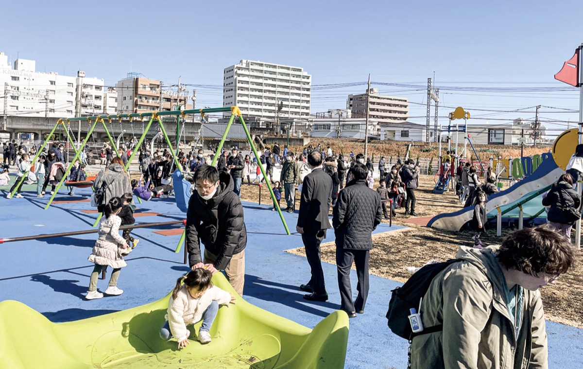 プロキオン前で行われたテープカットの後には多くの子どもたちが真新しい遊具を楽しんだ。訪れた50代の男性は「明るい公園になってうれしい。子どもも喜んでくれた」と笑顔で話した。