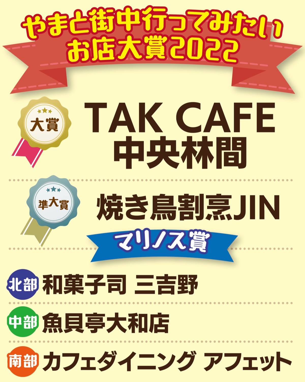 やまと街中お気に入りお店大賞実行委員会・大和商工会議所(本田誠一会頭)が主催する「やまと街中行ってみたいお店大賞2022」の投票結果がこのほど発表され、大賞には、イタリアンレストラン「TAK CAFE中央林間」、準大賞に大和東の「焼き鳥割烹JIN」がそれぞれ選ばれた。