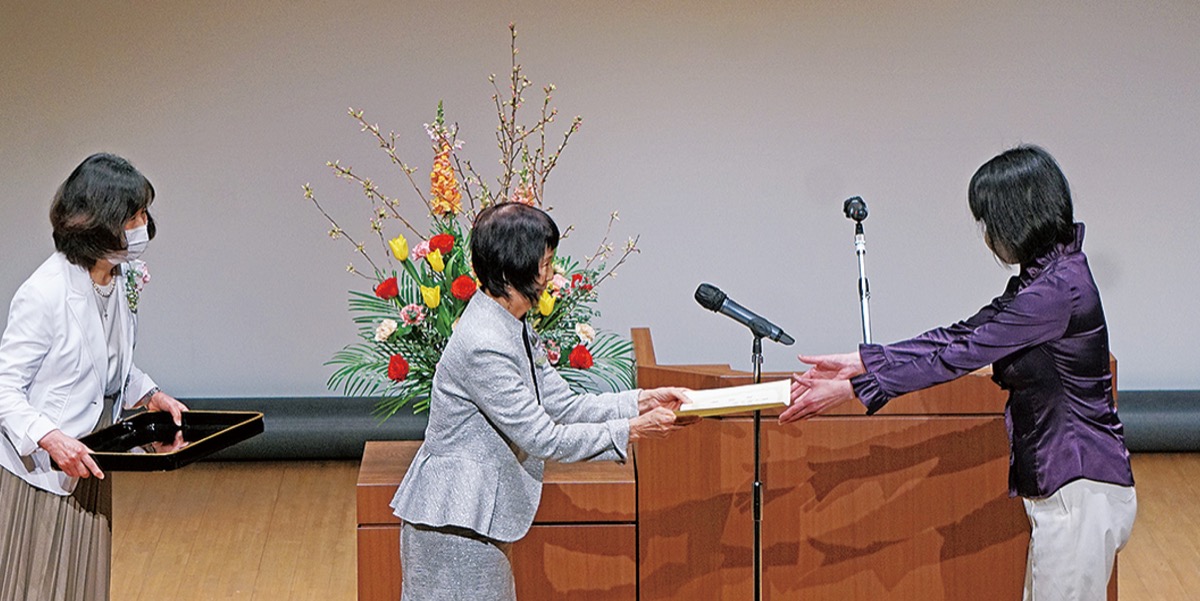また当日は50周年の記念事業の一環で募集した母親クラブの指針となる新たな「愛の一声標語」の表彰式も行われた。最優秀賞に選ばれたのは、みどりブロックに所属する西口則子さんの作品「子どもには手をかけ目をかけ心かけ」。森園会長から西口さんに表彰状が贈られた(=写真)。西口さんは「選んで頂きありがとうございました。子育てを振り返り実感したことを標語にしました」とコメントした。
