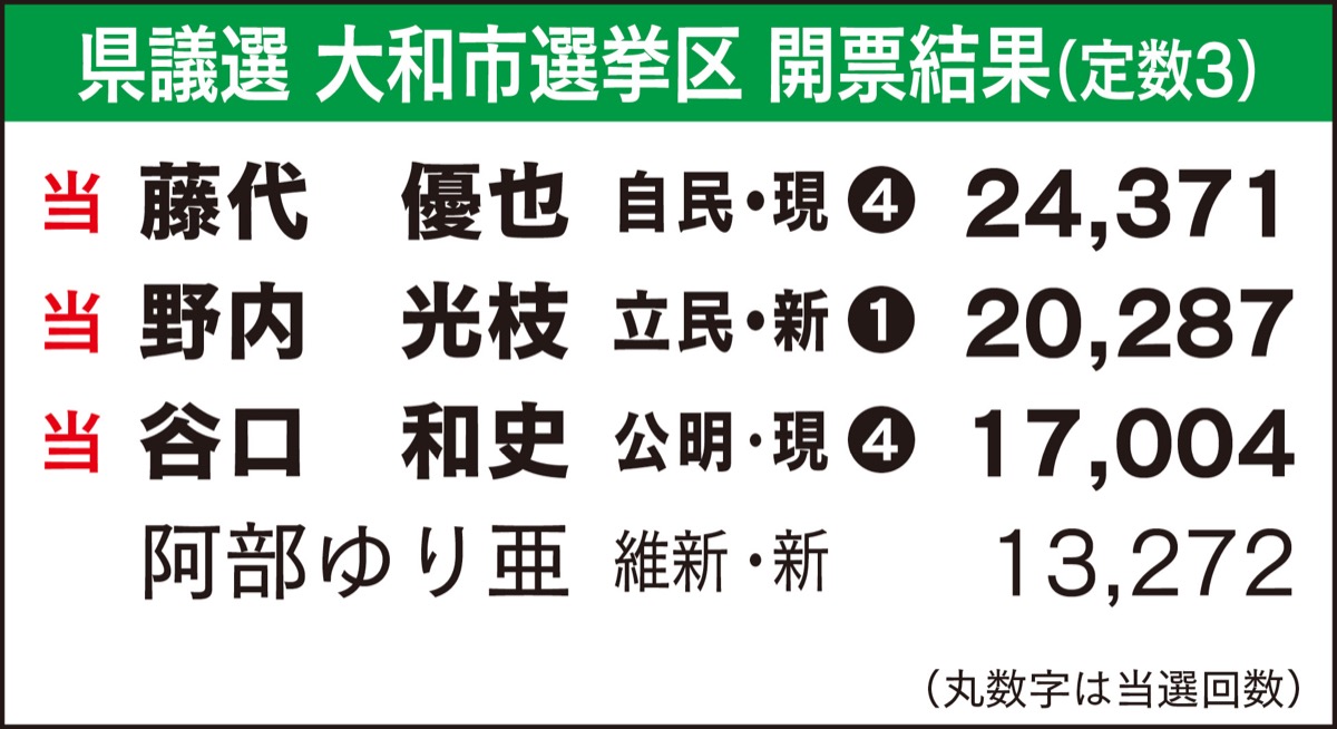 任期満了に伴う神奈川県議会議員選挙が4月9日に投開票され、現職2、新人2の4氏が争った大和市選挙区(定数3)は、現職で自由民主党の藤代優也氏(51)と公明党の谷口和史氏(61)がそれぞれ再選し、立憲民主党の野内光枝氏(55)が初当選した。野内氏は同選挙区ができた1958年以来、初となる女性県議となった。