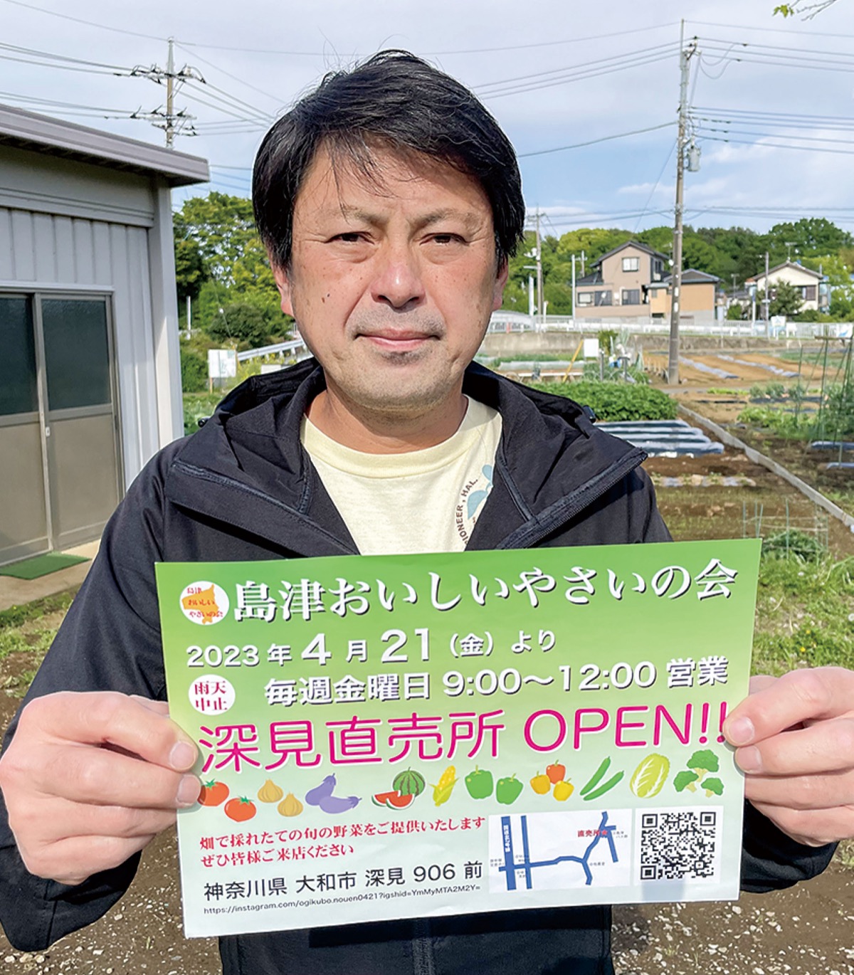 こうした中、市内の農業従事者がこの30年間で大幅に減少していることを知った荻窪さんは、つながりのある仲間や金融機関、団体などと連携して深見直売所の開設に奔走。藤沢街道の東名高速道路高架より南側、大和東高校の周辺一帯を指す「島津」地区の農家に声をかけた。当日は地元農家5軒が出店。ブロッコリーやレタス、チンゲン菜、タケノコなどを販売する予定だ。同会では、島津地区の生産物を販売することを通じて「地域社会の活性化」「地域の環境保全」「地域福祉の増進」を目指す。