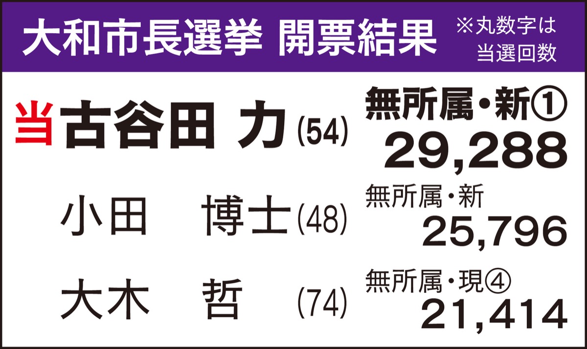 任期満了に伴う大和市長選挙は4月23日に投開票が行われ、無所属で新人の古谷田力氏(54)が、現職で5期目を目指した大木哲氏(74)、無所属の新人で自民党推薦の小田博士氏(48)を退け、初当選を果たした。