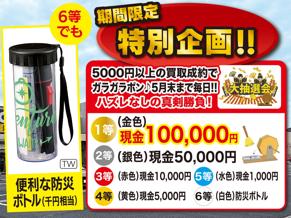 買取専門店「おたからや」のライズモール座間ひばりが丘店で、5千円以上の買取で最高10万円が当たるガラポン抽選会が開催されている。5月末までの開催中は6等でも千円相当の「防災ボトル」を進呈する(数量限定)。