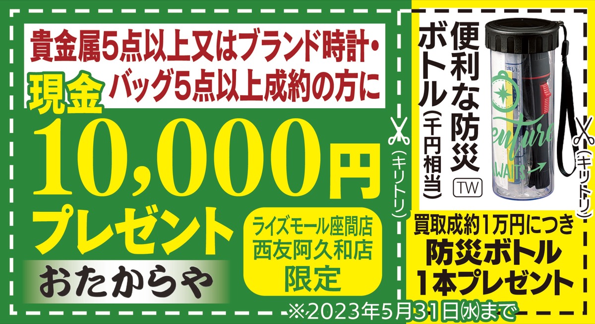 同店では、高級腕時計、貴金属、バッグ、各種ブランド品など、同店指定の品物5点以上成約時に下記クーポンを提示すると、成約額とは別に現金1万円を進呈中。