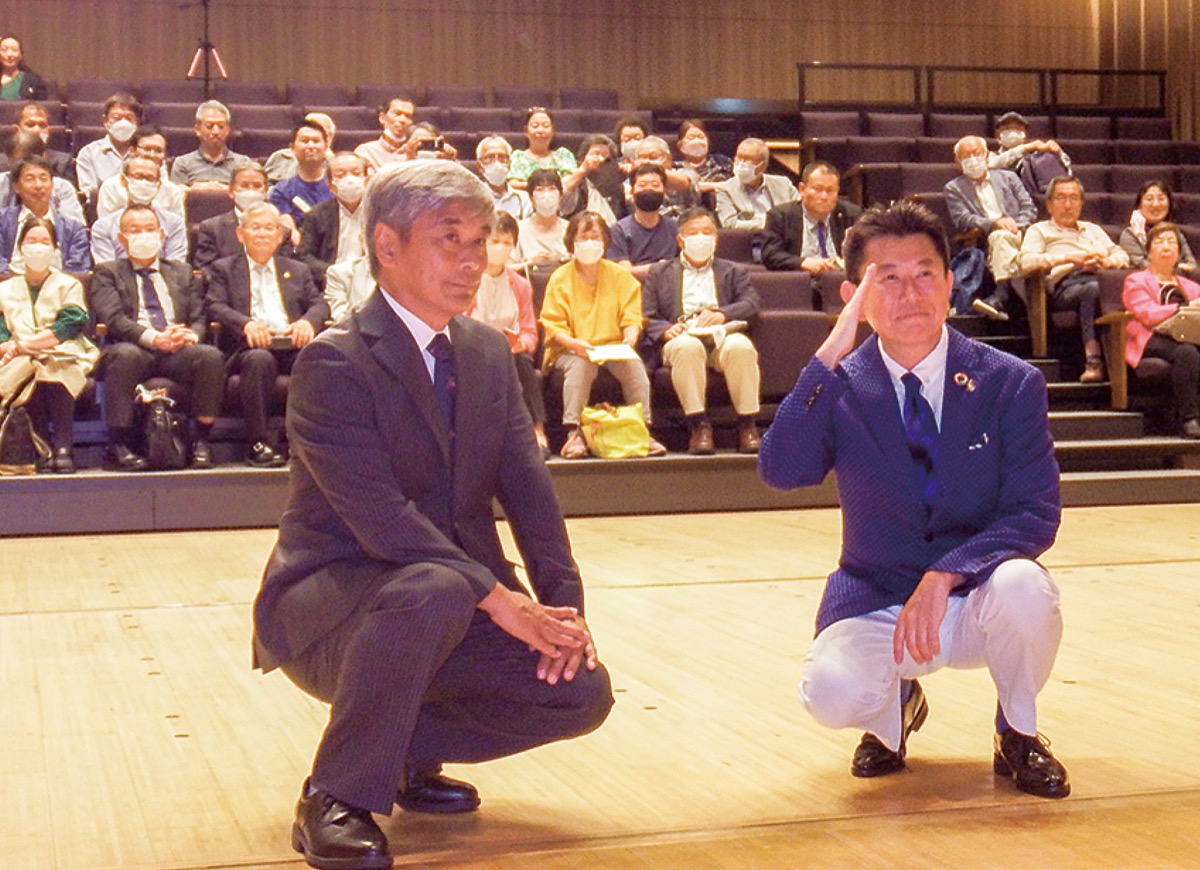 SDGsの達成について考える講演会「海で育つ」(主催/一般財団法人日本武芸道国際交流協会)が5月27日、シリウスサブホールで行われた。旧日本海軍連合艦隊司令長官・東郷平八郎のひ孫、東郷宏重氏と、開戦直前に東郷を指揮官に任命した山本権兵衛の玄孫で、市内在住の山本盛隆氏を講演者に招き、訪れた100人超の観衆が見守る中、海をテーマに講演を行った。