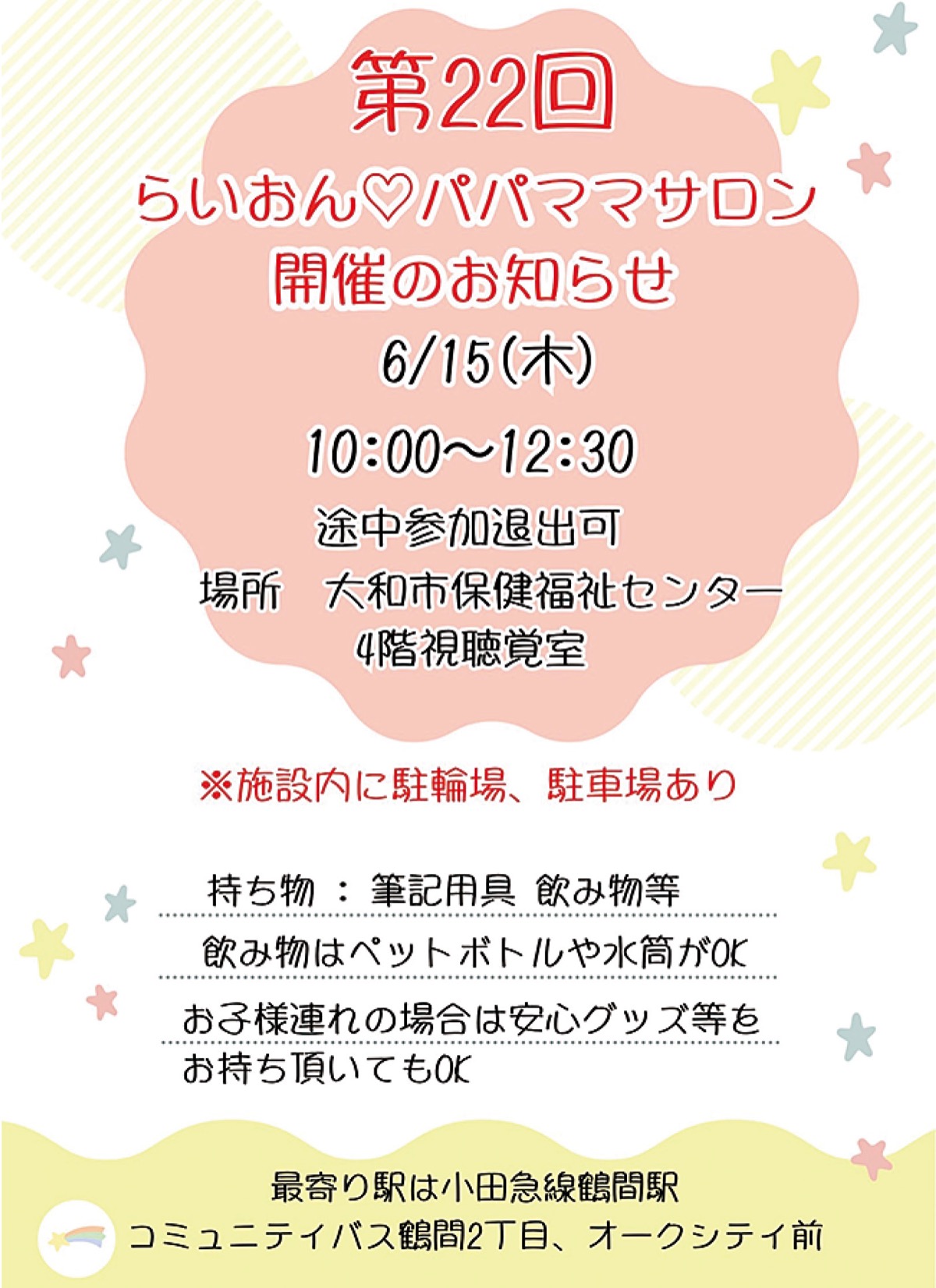 市内を中心に、障がいや特性がある子を持つ保護者をケアする団体「らいおん♡パパママサロン」(佐藤かおり代表=人物風土記で紹介)が6月15日(木)、子育てに関する情報交換や悩み相談ができるサロンを開く。