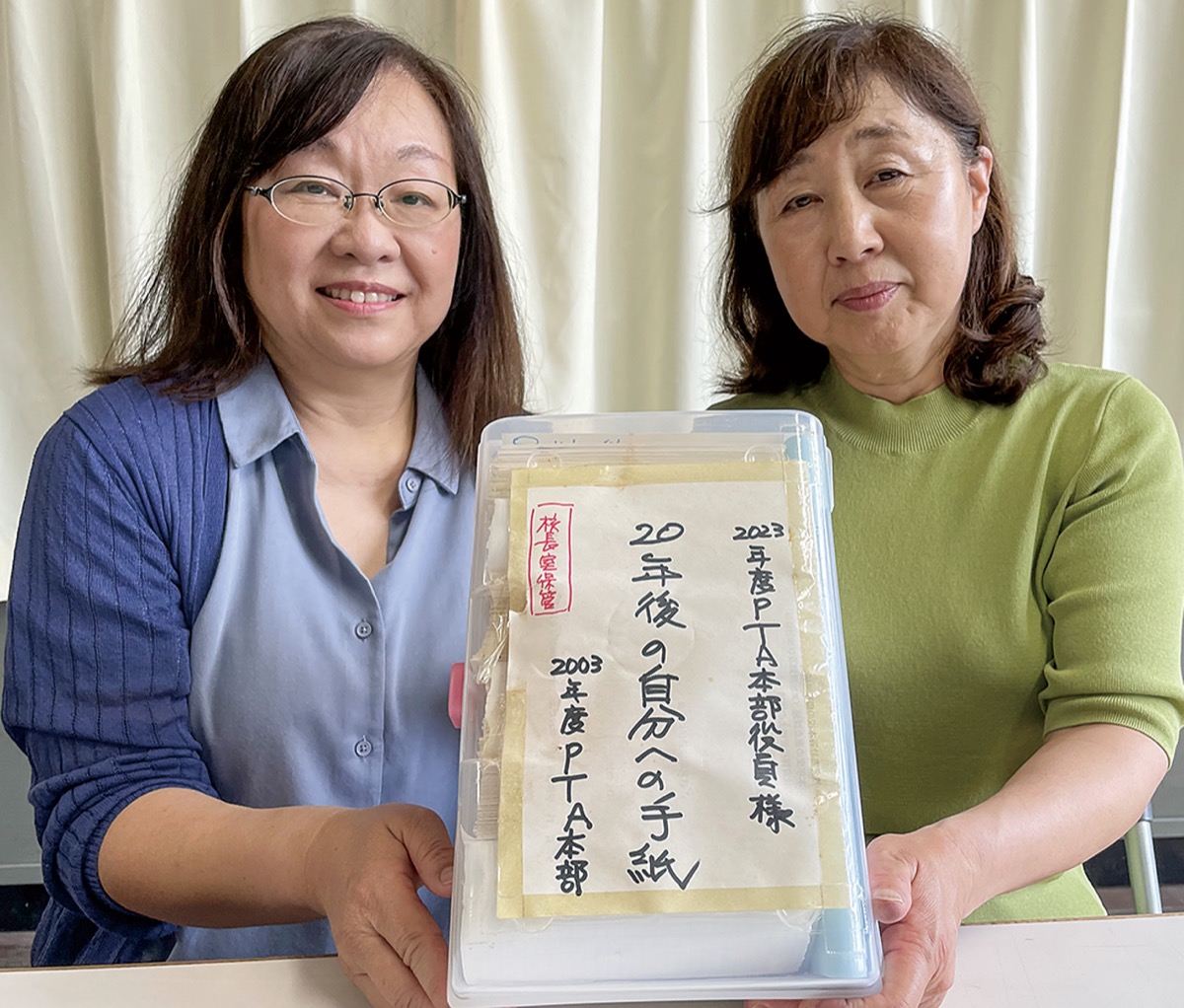 当時の本部役員だった高島佳子さん(60・深見西)と飯塚直子さん(63・深見東)はこれまで、校長やPTA役員が代わるたびに同校を訪れ、ハガキの取り次ぎを依頼してきた。高島さんは「炊事・洗濯をしてても、頭のどこかにハガキのことがあった」とこれまでを振り返る。
