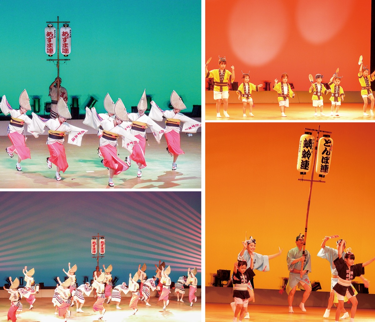 トップバッターは「あずま連」が務め、鉦(かね)や太鼓の音が鳴り響く中、光と影の演出で観客たちを魅了した。その後も、各連が趣向を凝らしたステージを展開。華やかな衣装や踊りに観客たちは酔いしれていた。
