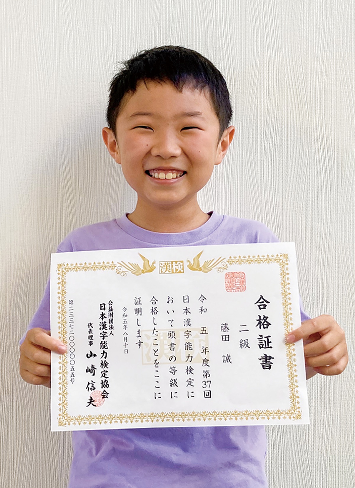 中央林間西在住の藤田誠くん(緑野小5年)が8月4日、日本漢字能力検定2級をCBT方式で受験し、172点で合格した。夏休みに入ってから試験日まで毎日欠かさず過去問に取り組み、日々の努力が実を結んだ。