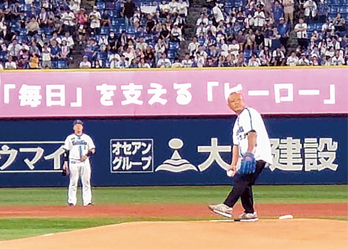 プロ野球のセ・リーグ公式戦「横浜DeNAベイスターズ―東京ヤクルトスワローズ」の24回戦が9月27日、横浜スタジアムで行われた。給食事業などを展開し、深見西に本社を構える「株式会社安田物産」(安田幹仁代表取締役社長)の冠試合として開催され、始球式には同社の安田智考取締役が登場した。