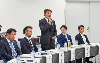 県内に13ある青年部に対して、行政や議員への政策提言を行う機運を高めてもらおうと初めて開催。県議会産業労働常任委員会に所属する山本哲(寒川町)、小島健一(横浜市青葉区)、長田進治(海老名市)、藤代優也(大和市)、市川和広(藤沢市)、山口美津夫(相模原市緑区)議員を招き、各会長がそれぞれの地域における経済や観光課題などについて意見を交わした。
