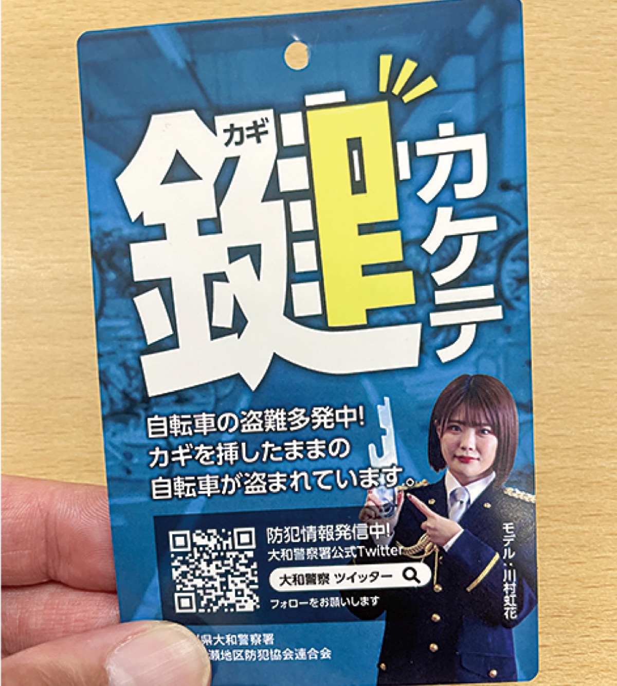 大和警察署では、自転車盗を警戒重点項目に設定し、今年4月から大型商業施設を中心に啓発活動を強化した。無施錠の自転車に署独自の「鍵カケテ札」(=写真)を取り付け、警戒を促す取り組みを続けている。