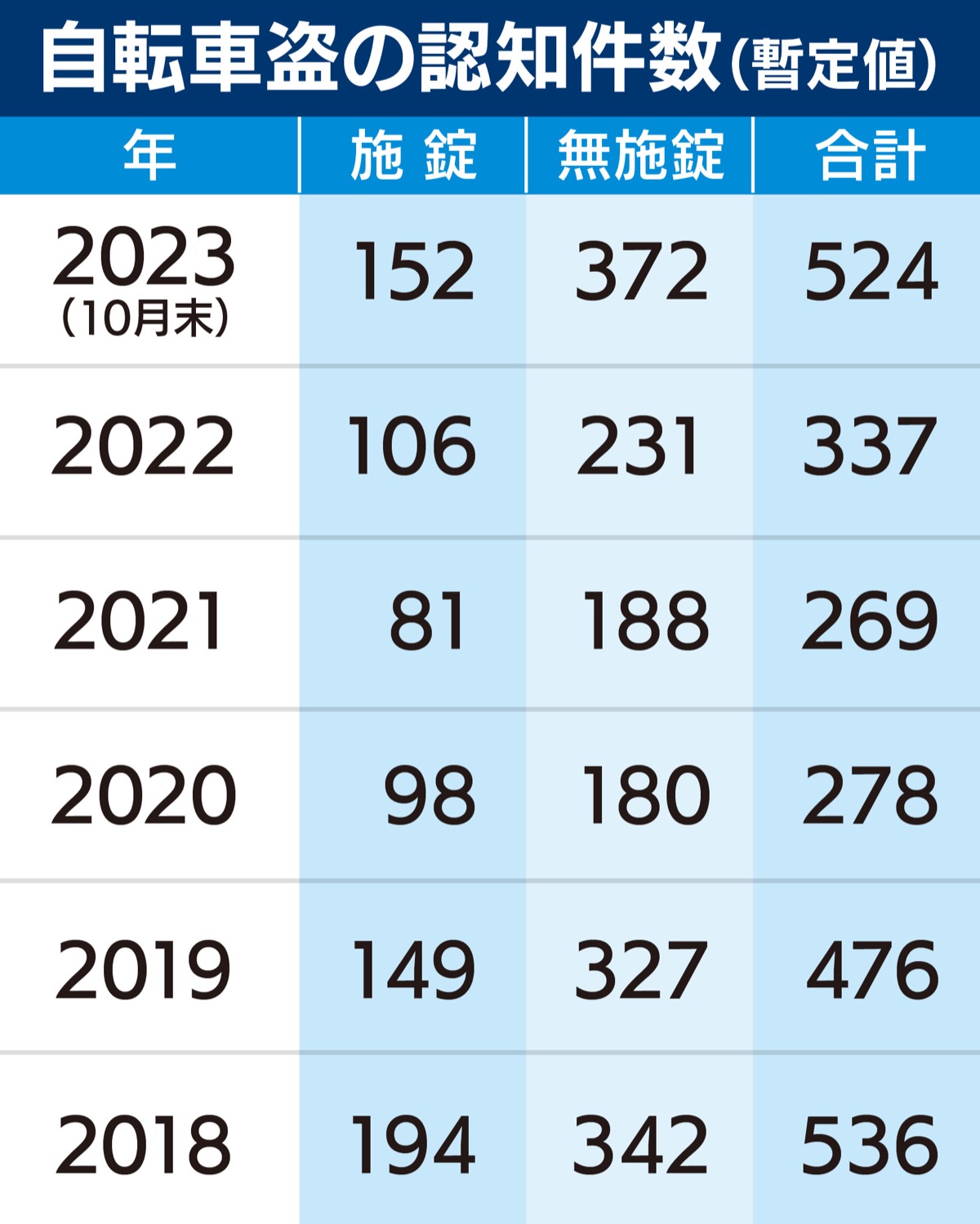 しかし、新型コロナの感染症法上の分類がインフルエンザと同じ「5類」に移行した今年は、10月末までに昨年のおよそ1・5倍にあたる524件が確認された。担当者によると、自転車盗の認知件数は、国内で新型コロナの感染が確認される以前の水準だという。