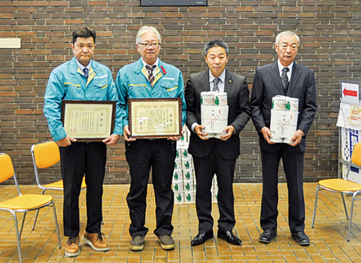 この寄贈式は、資源分別回収に協力する市民に感謝の気持ちを込めて毎年実施されており、当日は、古谷田力市長、石井会長、三森理事長らが出席。トイレットペーパーの寄贈後、古谷田市長と石井会長から同組合に感謝状が贈られた。式後には、市役所を訪れていた人にも一部のトイレットペーパーが配られた。