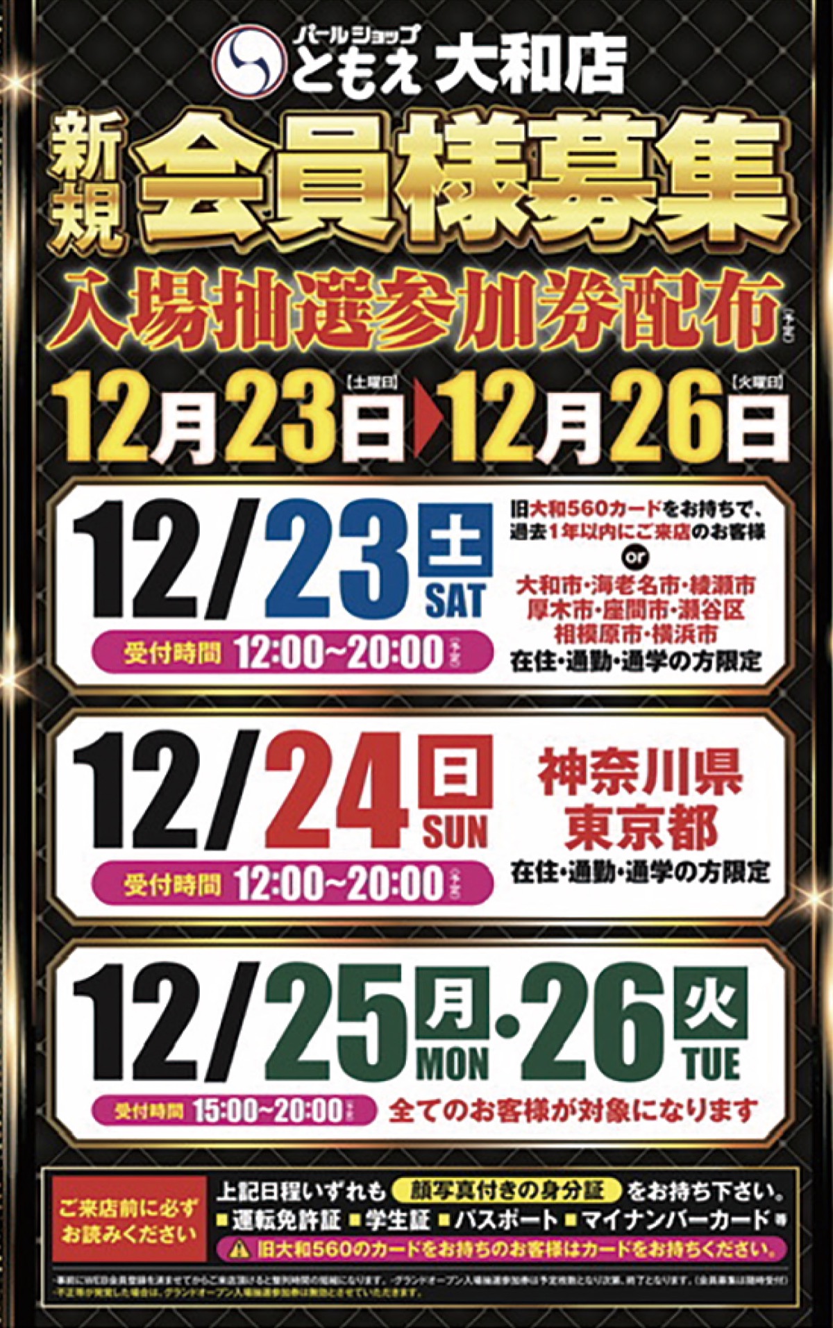 オープンに先駆け、23日(土)〜26日(火)までの期間、グランドオープン日の入場抽選参加券配布と新規会員の募集を行っている。抽選参加券配布初日は大和市近隣エリアに在住・通勤・通学の方限定に行う予定となっており、12時〜20時に直接店舗で実施される。登録会にはスマートフォンと身分証明書を持参。