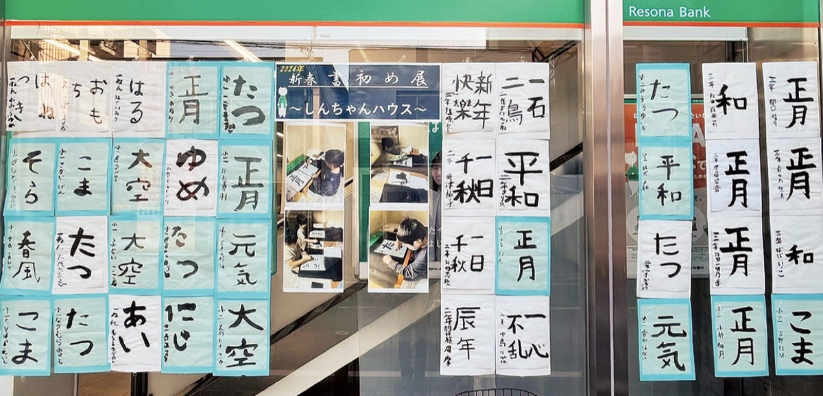 放課後児童クラブ「地域家族しんちゃんハウス」に通う1〜6年生の児童が書いた書初めが、りそな銀行鶴間支店(西鶴間1の3の5)とイオンモール大和4階こども〜る鶴間(下鶴間1の2の1)に展示されている。