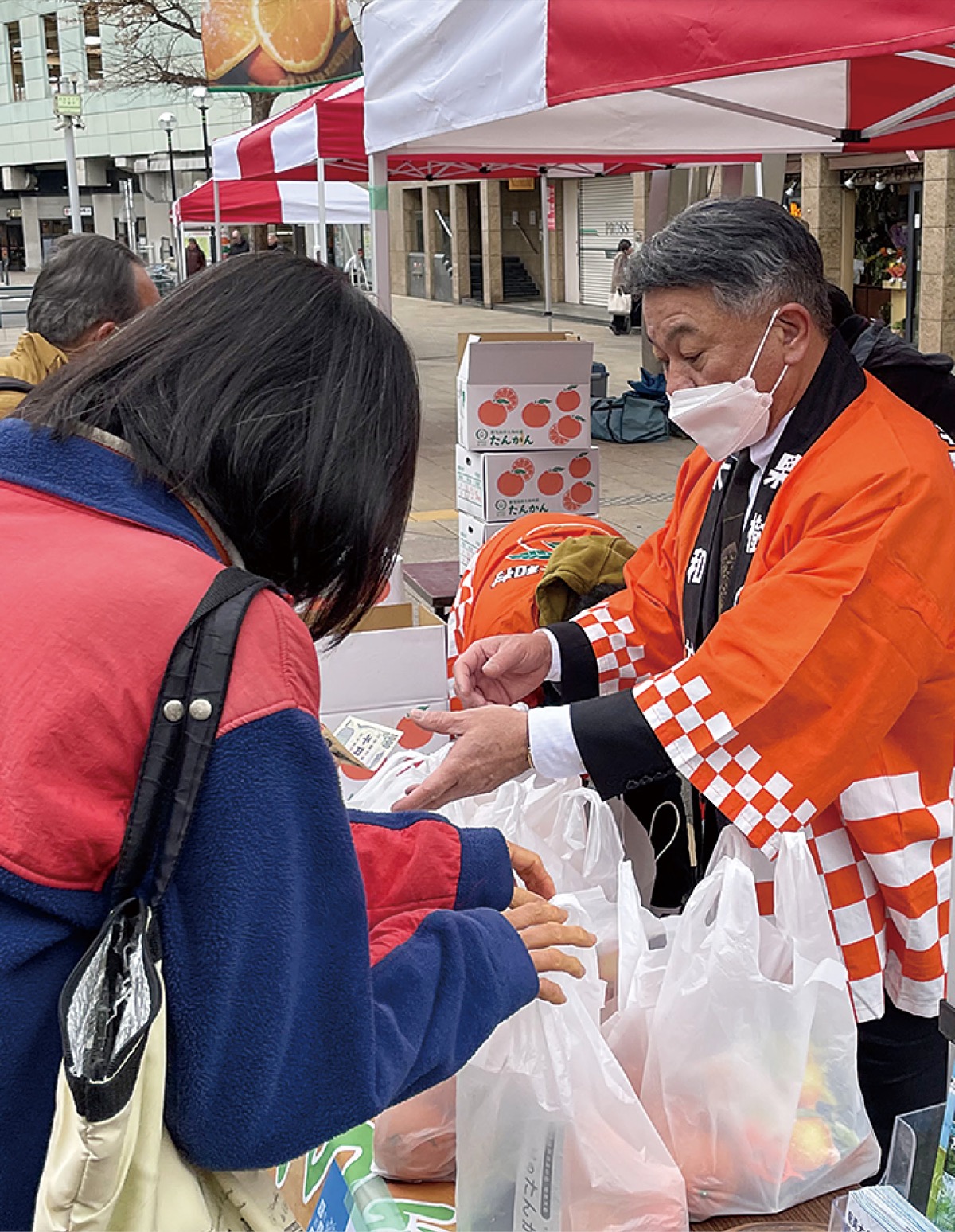 この日は、鹿児島県大和村からも出店があり、伊集院幼村長や同村の職員らが、現地の特産品の一つであるタンカンを販売した。