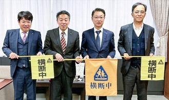 寄贈式で古谷田市長は「毎年新しい横断旗を頂けるのはとてもありがたいこと」と謝意を述べ、新村会長は「横断旗を活用していただき、1件でも事故の減少につながってほしい」と、地域の交通安全を願った。
