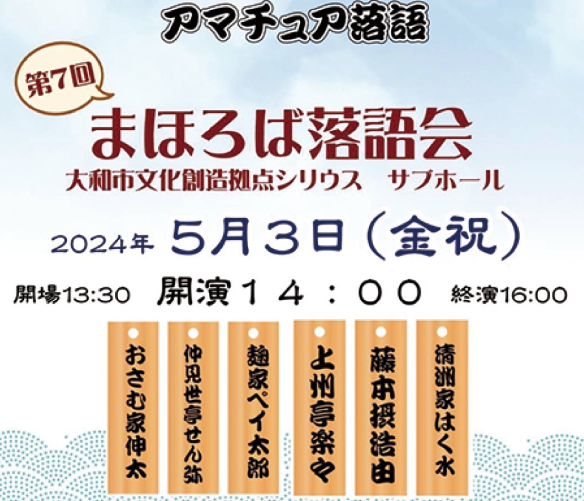 アマチュア落語家らによる「第7回まほろば落語会」(主催/やまと噺の会)が5月3日(祝)、シリウス1階サブホールで開催される。午後2時開演(1時30分開場)。4時終演。事前予約制で先着130人。木戸銭は500円。