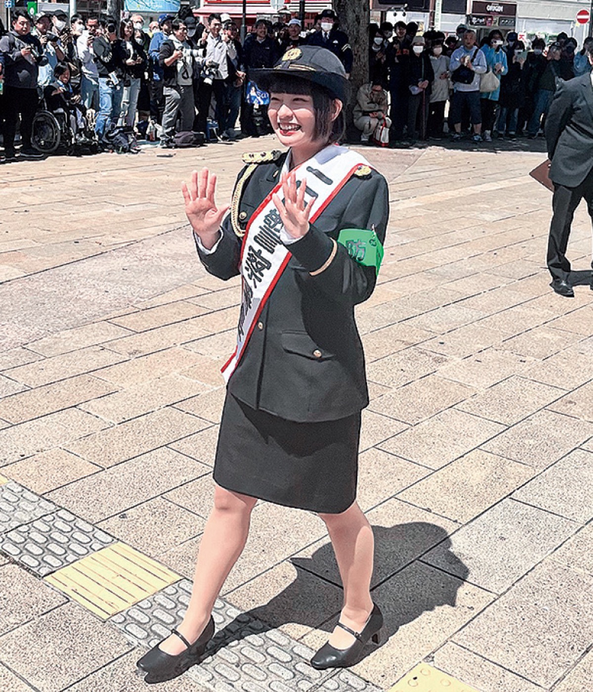キャンペーンの冒頭では、生活安全担当の向井瑞樹次長から宇野乃さんに委嘱状とタスキが渡され、宇野乃さんは「皆で協力して、子どもの安全を守るとともに、交通事故ゼロで犯罪被害のない明るい未来を作りましょう」と声高らかに市民に訴えた。