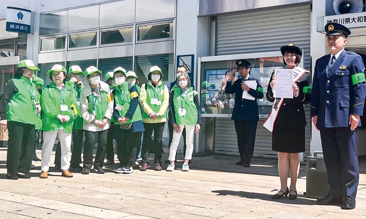 その後、大和女性防犯会(小菅陽子会長)の会員が中心となって、歩行者に啓発品を配りながら、特殊詐欺や自転車盗難などへの対策を呼びかけた。