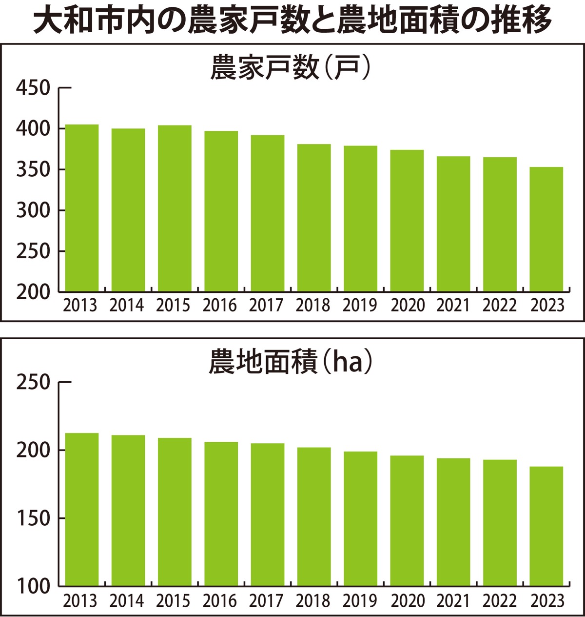市農政課によると13年度の農家戸数が405戸なのに対し、23年度は353戸と10年間で52戸減少している。さらに市内の農地面積も10年間で約24ヘクタール減少しており、これは東京ドーム約5個分の大きさとなる。