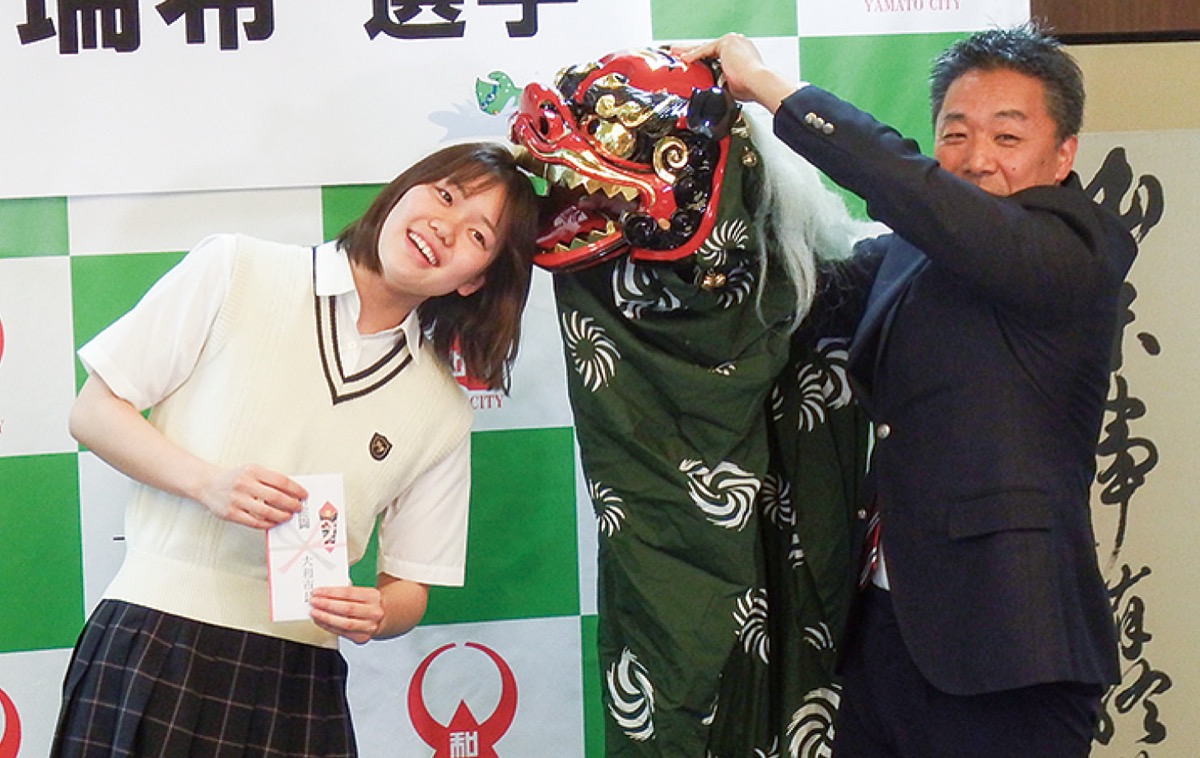 表敬訪問で古谷田市長は「開催までの2カ月、努力を積み重ねていただき、市民、そして国民に勇気と感動を与えていただきたい」と激励した。古谷田市長が持参した獅子舞で「がぶり」と邪気を払うと、会場は和やかな雰囲気に包まれた。